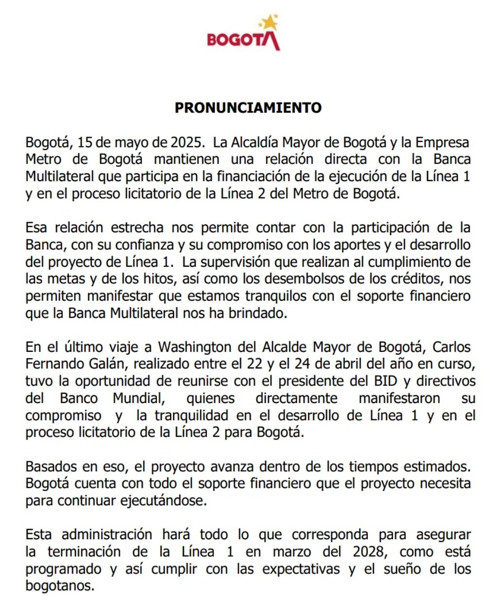 “El proyecto avanza dentro de los tiempos estimados. Bogotá cuenta con todo el soporte financiero que el proyecto necesita para continuar ejecutándose. Esta administración hará todo lo que corresponda para asegurar la terminación de la Línea 1 en marzo del 2028, como está programado y así cumplir con las expectativas y el sueño de los bogotanos”, indicó el comunicado oficial.