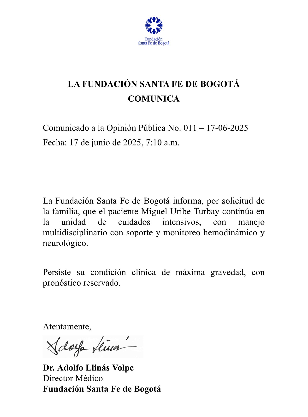 Según el comunicado, el paciente continúa bajo “manejo multidisciplinario con soporte y monitoreo hemodinámico y neurológico”. La institución médica reiteró que la condición clínica de Uribe Turbay sigue siendo “de máxima gravedad” y su pronóstico continúa siendo reservado.