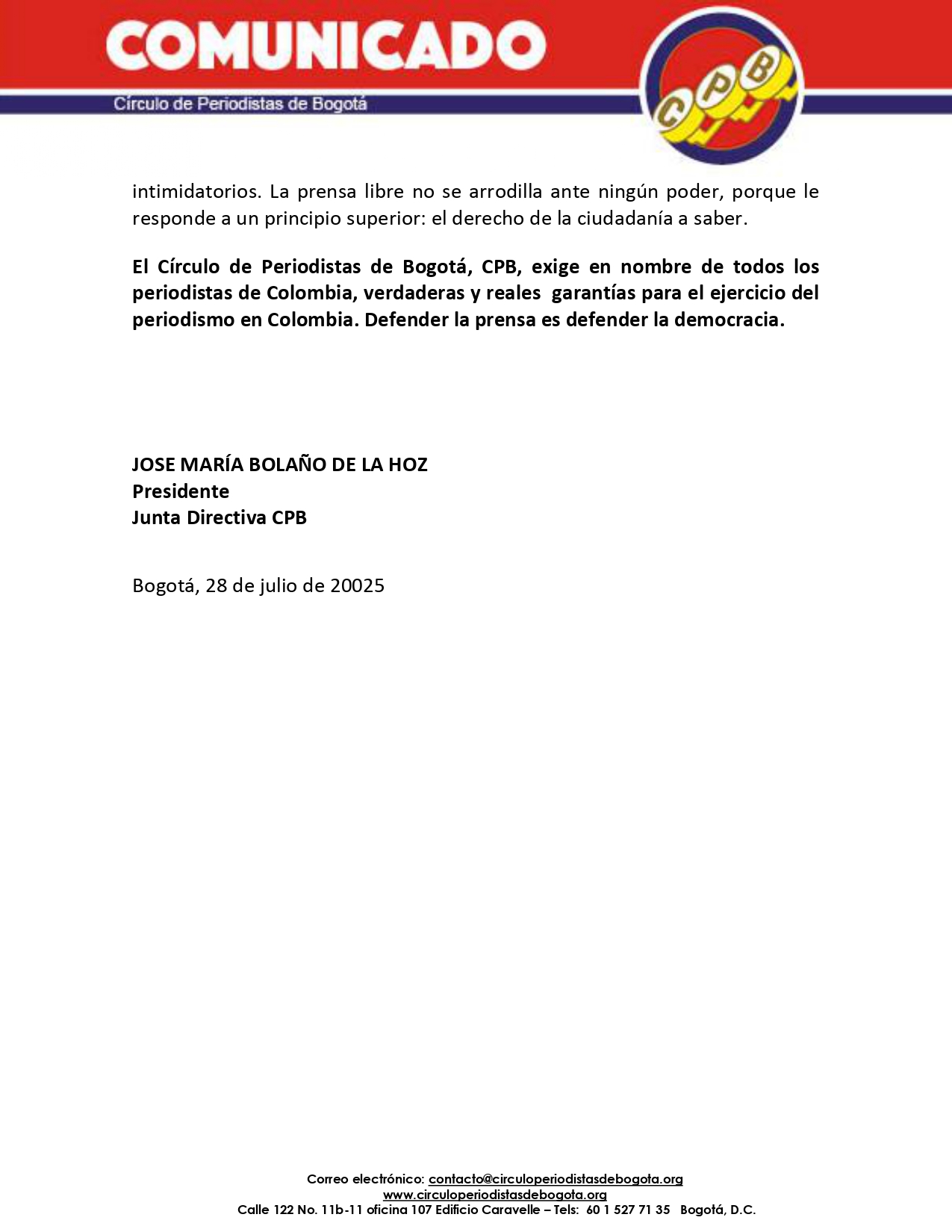 El Círculo de Periodistas de Bogotá, CPB, exige en nombre de todos los periodistas de Colombia, verdaderas y reales garantías para el ejercicio del periodismo en Colombia. Defender la prensa es defender la democracia.
