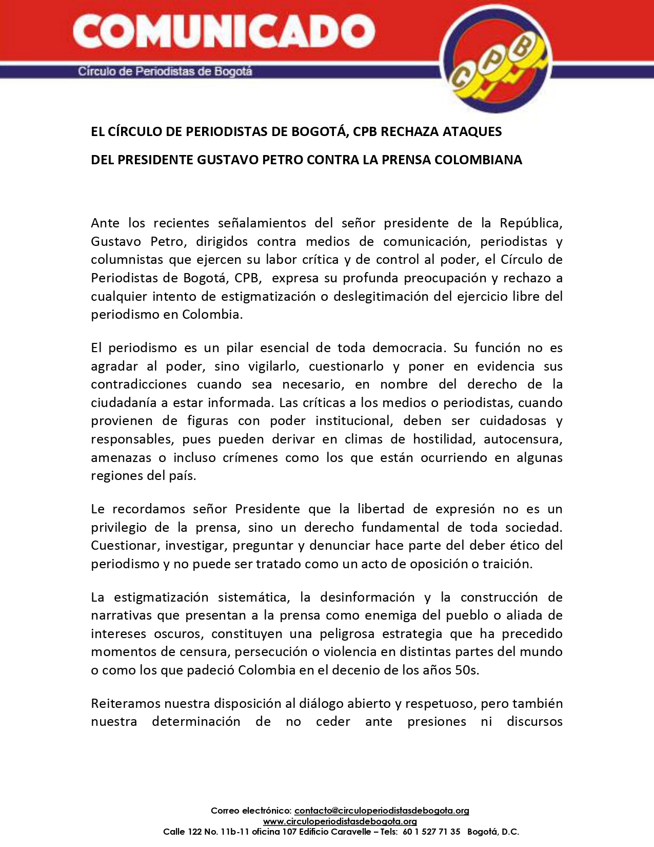 Ante los recientes señalamientos del señor presidente de la República, Gustavo Petro, dirigidos contra medios de comunicación, periodistas y columnistas que ejercen su labor crítica y de control al poder, el Círculo de Periodistas de Bogotá, CPB, expresa su profunda preocupación y rechazo a cualquier intento de estigmatización o deslegitimación del ejercicio libre del periodismo en Colombia.