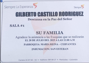 Manizales, julio 19_ 2025_ RAM _ La noche del viernes 18 falleció en Manizales,Gilberto Castillo “El señor de los perritos” … así lo conocían… Un hombre con valores intachable y lleno de vida. Gran abuelo tío. Hermano y esposo… Amaba la bici y recorría la ciudad dejando amigos en todo lado.