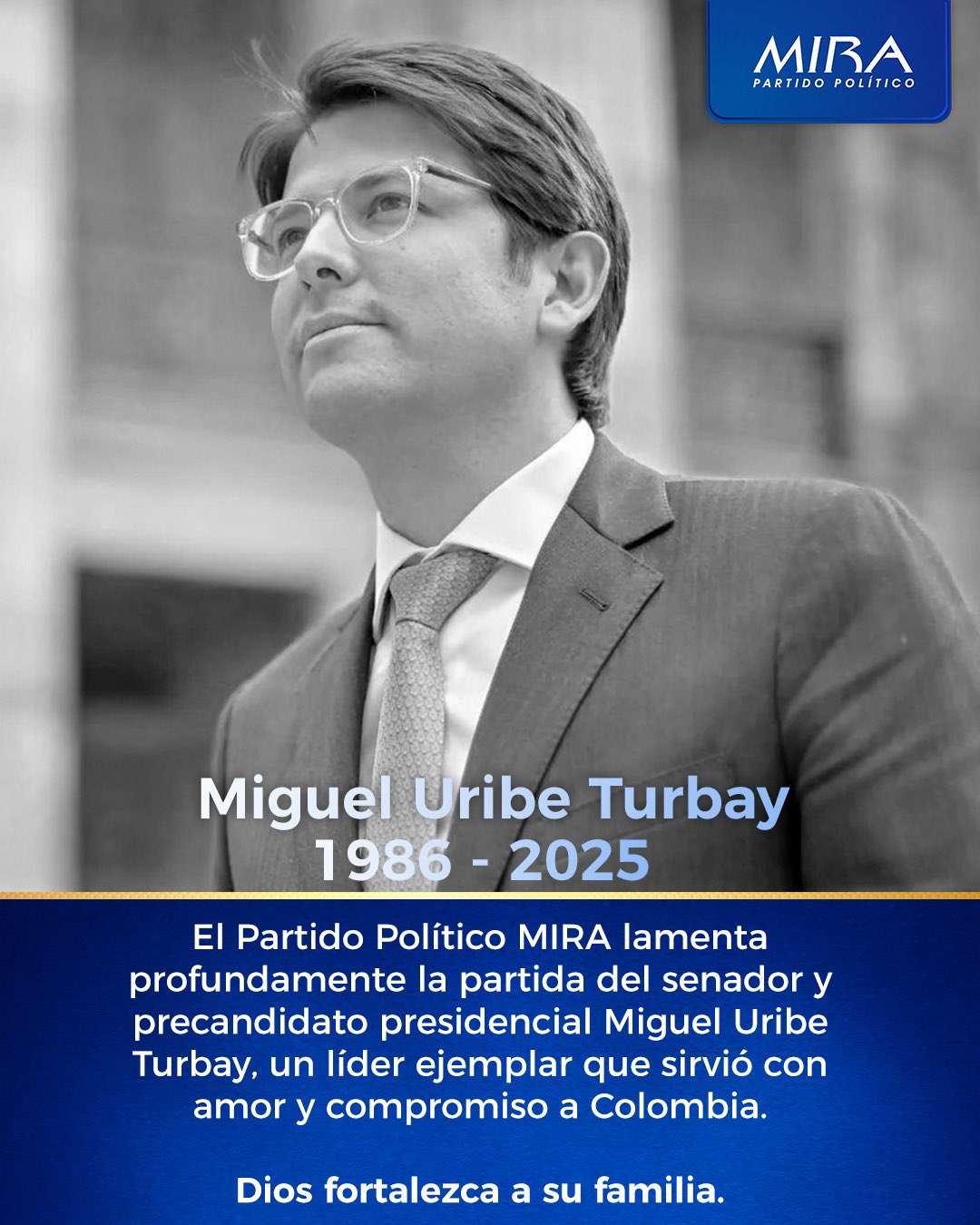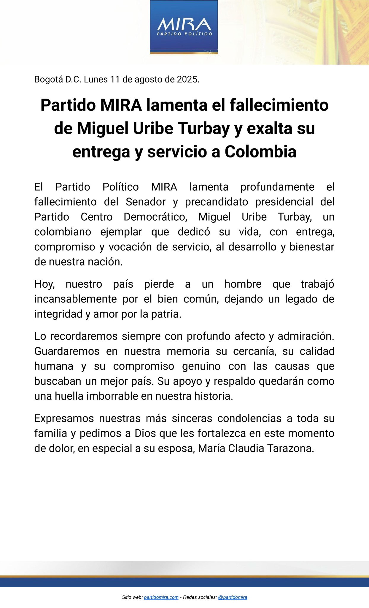 Bogotá, agosto 11_ 2025_ RAM _ El Partido Político MIRA expresó su pesar por la muerte de Miguel Uribe Turbay, senador y precandidato presidencial que falleció el 11 de agosto de 2025, tras dos meses de lucha después de un atentado sufrido el 7 de junio en Bogotá. El Partido Político MIRA expresó su pesar por la muerte de Miguel Uribe Turbay, senador y precandidato presidencial que falleció el 11 de agosto de 2025, tras dos meses de lucha después de un atentado sufrido el 7 de junio en Bogotá. En un comunicado el partido lamentado su fallecimiento uniendose al apoyo que recibió de varios sectores políticos durante su carrera.