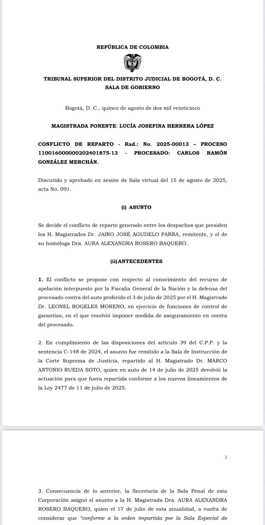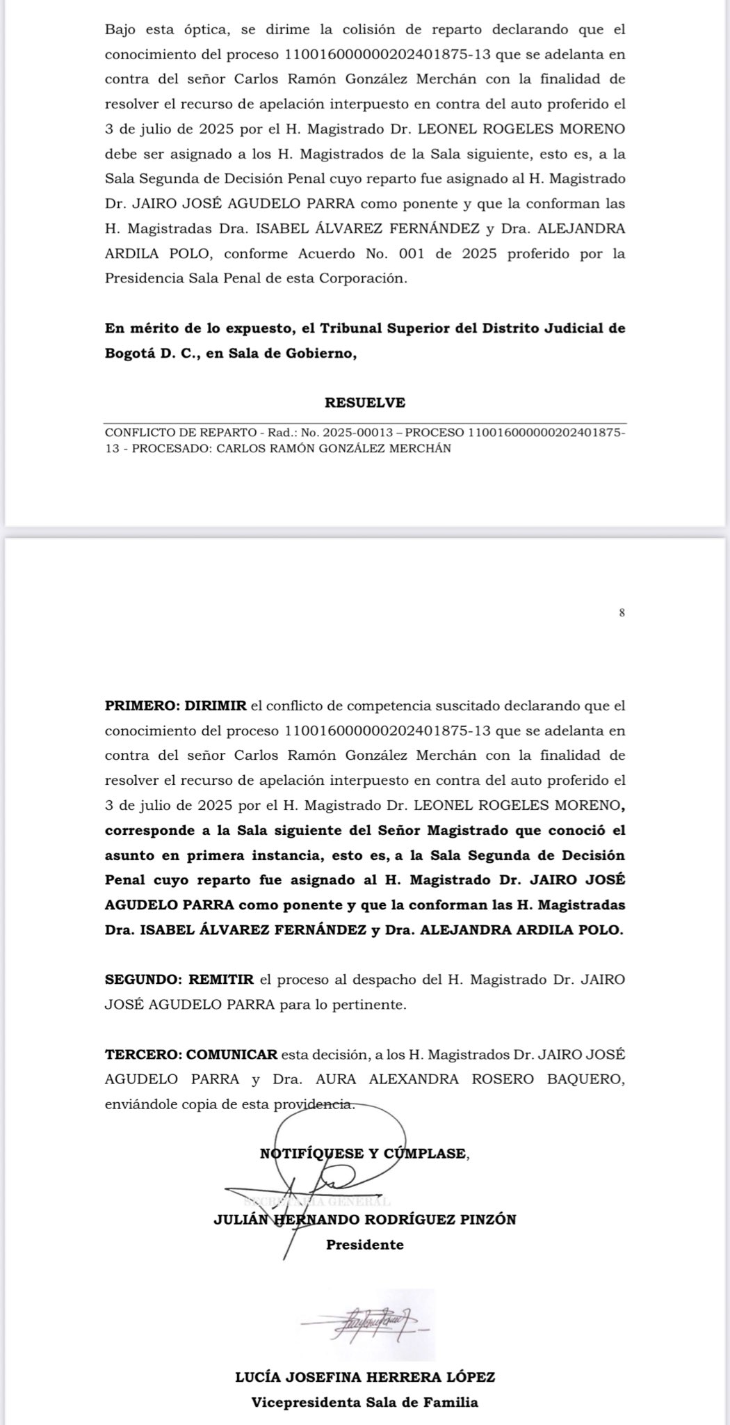 La Sala de Gobierno del Tribunal Superior de Bogotá resolvió conflicto de reparto y definió que la apelación de la medida de aseguramiento contra Carlos Ramón González Merchán será conocida por la Sala Segunda de Decisión Penal, con ponencia del magistrado Jairo José Agudelo.
