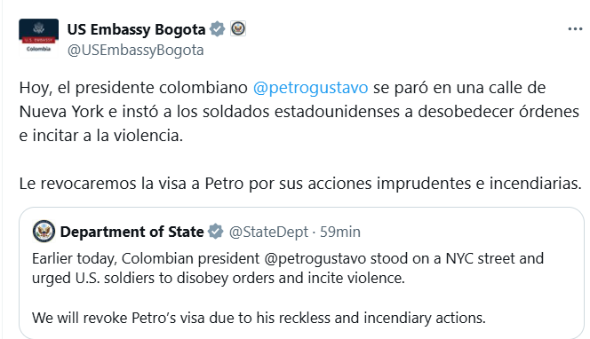 En su publicación compartida en la cuenta de X, el Departamento de Estado dijo: «Revocaremos la visa de Petro debido a sus acciones imprudentes e incendiarias“.
