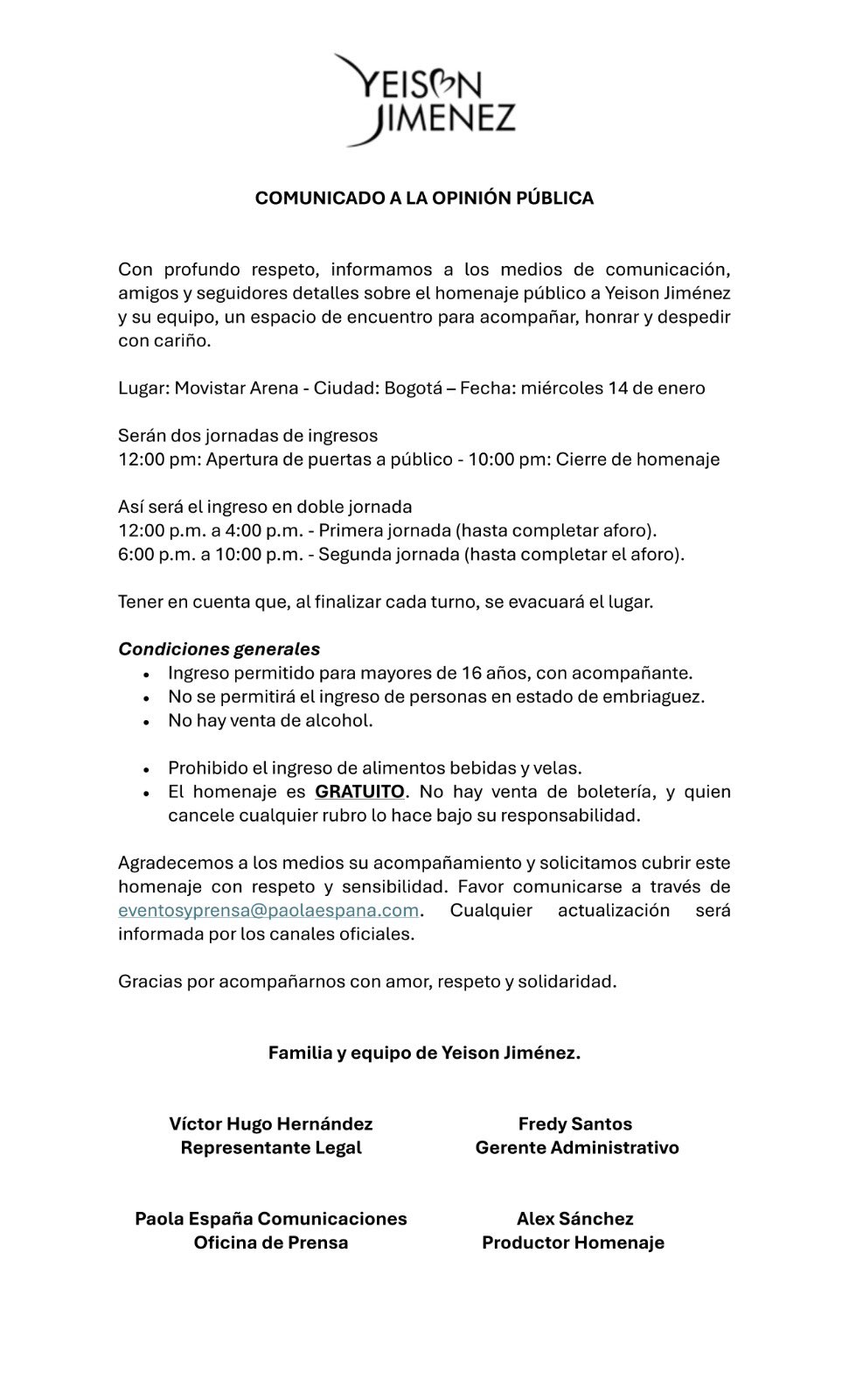 Bogotá, enero 13_ 2026_ RAM _El homenaje póstumo a Yeison Jiménez se llevará a cabo el miércoles 14 de enero en el Movistar Arena, organizado por su familia y equipo. El cuerpo del artista fue recibido el 13 de enero tras el accidente en su avioneta. La ceremonia busca rendirle homenaje a su legado musical y personal, con la participación de artistas y seguidores. Se espera una gran asistencia, y se han dado detalles sobre acceso y horarios para quienes deseen asistir.