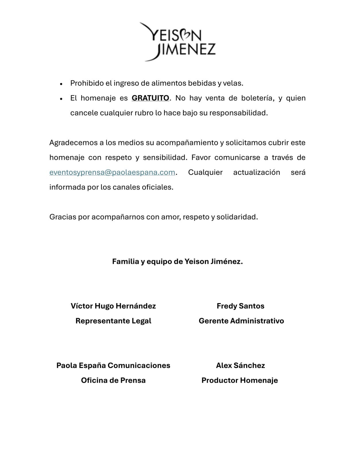 - El homenaje es GRATUITO. No hay venta de boletería, y quien cancele cualquier rubro lo hace bajo su responsabilidad.