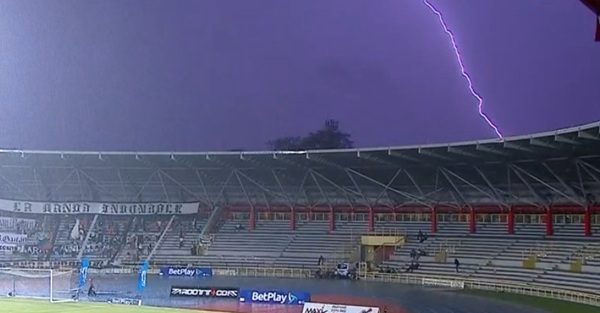 Un rayo que cayó muy cerca del escenario deportivo fue la alerta definitiva para que el juez central detuviera el partido y ordenara a todas las personas ir a la zona de los vestuarios. El tiempo oficial en que quedó suspendido fue al minuto 11, mientras que se esperaba por novedades por parte del cuerpo arbitral o de Dimayor.