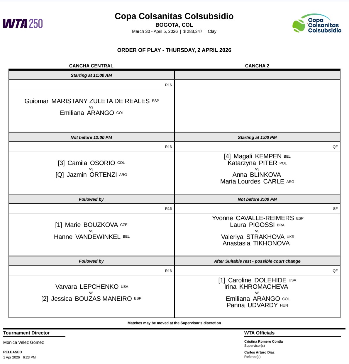Bogotá, abril 01, 2026_ RAM _Las tenistas colombianas Camila Osorio y Emiliana Arango regresarán este jueves a la acción en la Copa Colsanitas Colsubsidio 2026 para afrontar sus partidos de segunda ronda; de ganar ambas, será la primera ocasión en 18 años en que dos jugadoras cafeteras accedan a la fase de las ocho mejores del torneo WTA de mayor tradición en América Latina. En un rato, la organización revelará los horarios de sus partidos.