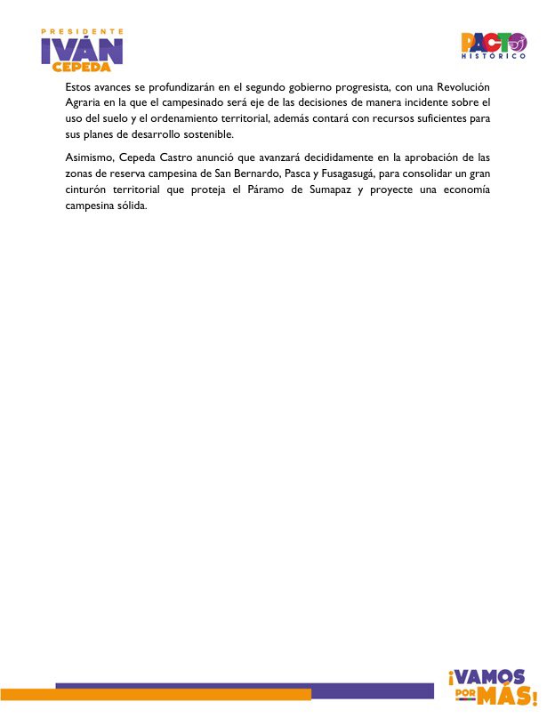 “Desde este territorio que representa esa confrontación histórica de modelos de país, en esta multitudinaria concentración en Sumapaz, reto a la extrema derecha y a sus dos candidaturas, a la senadora Paloma Valencia y al abogado Abelardo de la Espriella, a debatir sobre propuestas de fondo. Llegó el debate, ahora sí”, afirmó.