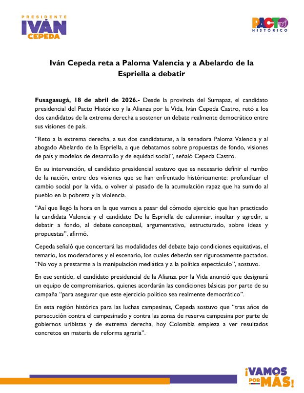 “Reto a la extrema derecha, a sus dos candidaturas, a la senadora Paloma Valencia y al abogado Abelardo de la Espriella, a que debatamos sobre propuestas de fondo, visiones de país y modelos de desarrollo y de equidad social”, señaló Cepeda Castro.