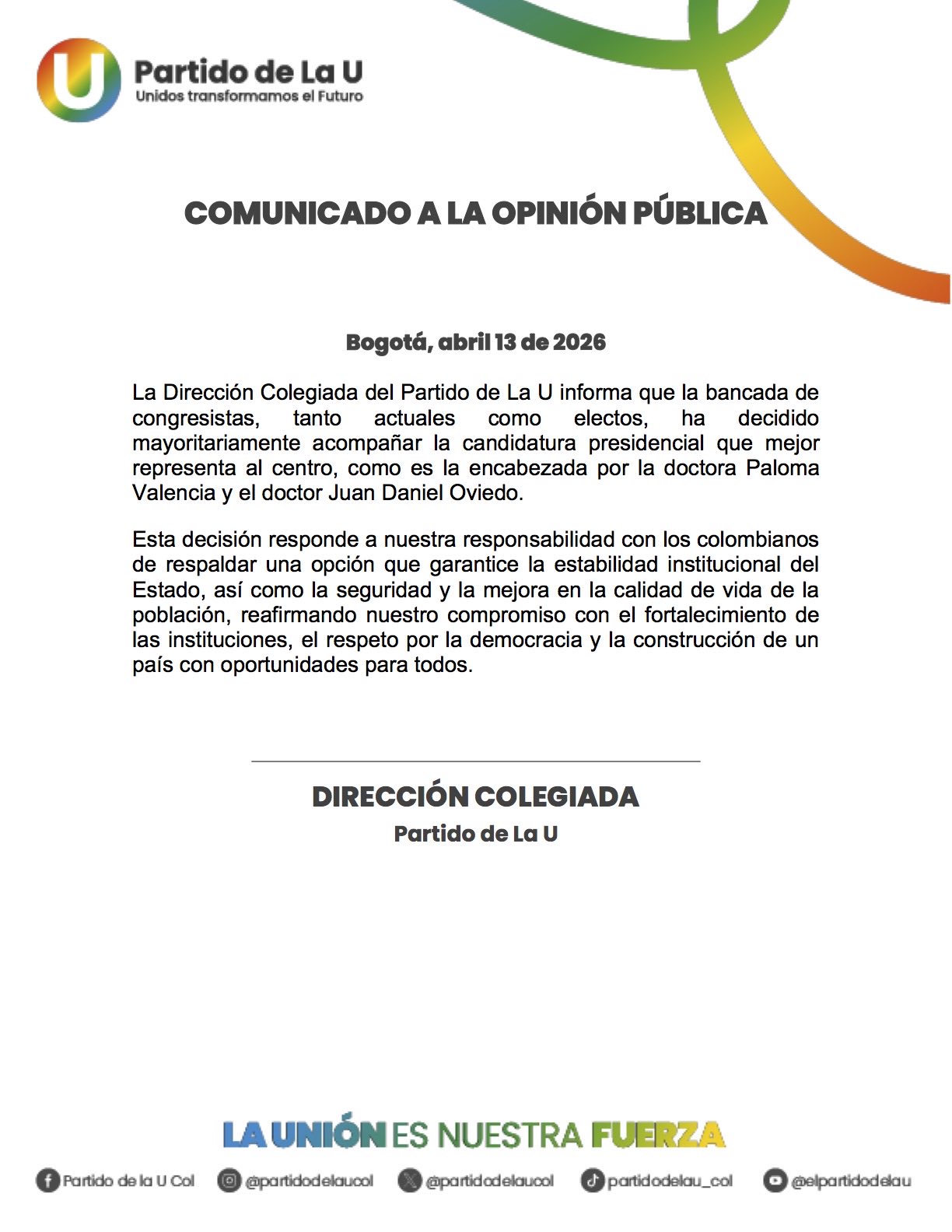 Bogotá, abril 13, 2026_ RAM _La Dirección Colegiada del Partido de la U confirmó que su bancada de congresistas, tanto actuales como electos, decidió mayoritariamente acompañar la candidatura presidencial encabezada por Paloma Valencia y Juan Daniel Oviedo.